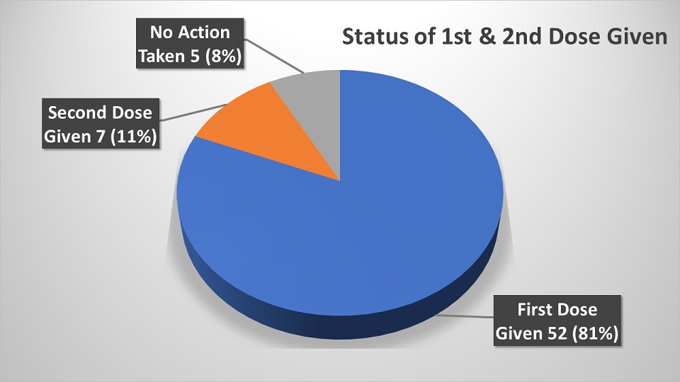 Status of Vaccination of Anand Dham Residents: We are proud to announce that 81% of our residents have taken first dose of Vaccination and 11% of the have taken both dose of vaccine. All of them will be vaccinated as per their turn for second dose. आनंद धाम निवासियों के टीकाकरण की स्थिति: हमें यह घोषणा करते हुए गर्व हो रहा है कि हमारे ८१% निवासियों ने टीकाकरण की पहली खुराक ले ली है और ११% ने टीके की दोनों खुराक ले ली है। उन सभी को दूसरी खुराक के लिए उनकी बारी के अनुसार टीका लगाया जाएगा।
